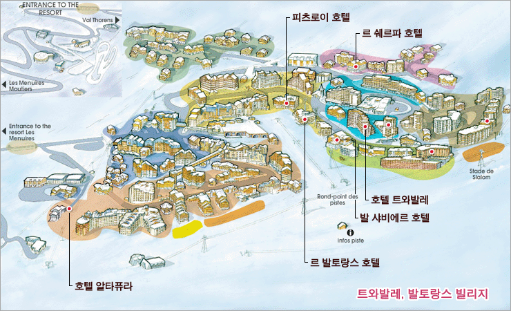 Æ®¿Í¹ß·¹(3Vallees)ÀÇ ½ºÅ°Áö¿ª Áß ÇϳªÀÎ ¹ßÅä¶û½º(ValThorens) ºô¸®Áö¿¡ À§Ä¡ÇÑ °¢°¢ÀÇ È£ÅÚÀÇ À§Ä¡¸¦ ³ªÅ¸³»´Â ÁöµµÀÔ´Ï´Ù. À̰÷¿¡ ³ª¿ÍÀÖ´Â °¢ È£ÅÚÀº ½ºÅ°½ºÅ°´åÄÄ¿¡¼ ¼±Á¤ÇÏ¿© »ç¿ëÇÏ´Â ÃÖ°íÀÇ ½Ã¼³°ú °¡Àå ÁÁÀº°÷¿¡ À§Ä¡Çϰí ÀÖ½À´Ï´Ù.