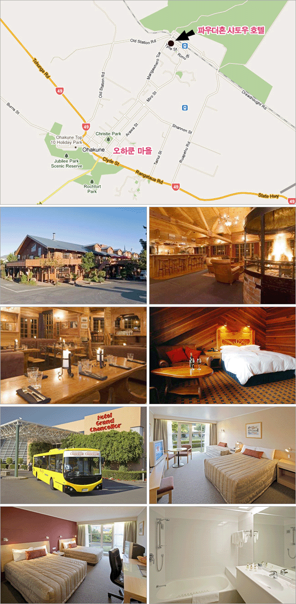 ¿ÀÇÏÄï(Ohakune)¸¶À»¿¡ À§Ä¡ÇÑ ÆÄ¿ì´õÈ¥ »þÅä¿ì È£ÅÚÀÇ À§Ä¡¸¦ ³ªÅ¸³»´Â ÁöµµÀÔ´Ï´Ù. È£ÅÚÀº ¸¶À» ºÏÂÊ, Åë°¡¸®·Î(Tongariro) ±¹¸³°ø¿ø ÀÔ±¸¿¡ À§Ä¡Çϰí ÀÖ½À´Ï´Ù. ¶ÇÇÑ ¿ÀŬ·£µå °øÇ× È£ÅÚÀÎ ±×·£µå þ½½·¯ È£ÅÚÀº °øÇ׿¡¼ 5ºÐ °Å¸®¿¡ À§Ä¡Çϰí ÀÖ½À´Ï´Ù.